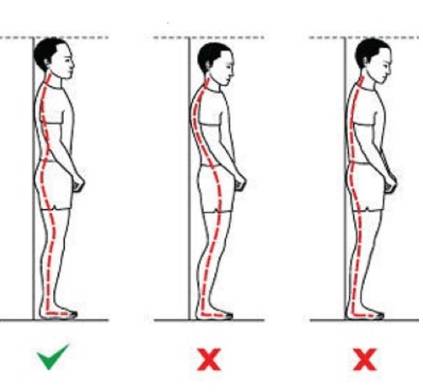При правильной осанке плечи отведены назад и расслаблены, голова стоит ровно, грудь чуть вперед, поясница принимает форму легкого изгиба, колени выпрямлены, но расслаблены.