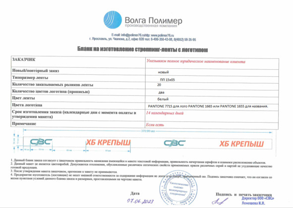 Макет на ленту с логотипом, утвержденный и подписанный клиентом