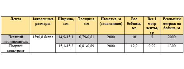2) Меньшая намотка ленты на бобину, в сравнении с заявленной на этикетке;