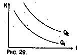 Графически технический прогресс может быть отображен сдвигом вниз изокванты, характеризующей определенный объем выпуска и, возможно, изменением ее конфигурации. На рис. изокванта Q1 характеризует тот же объем выпуска, что и изокванта Q0. Но теперь этот объем может быть произведен с использованием меньших количеств ресурсов К и L.