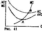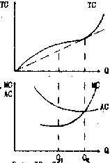Как видно из рис., при объеме выпуска Q2 долгосрочные средние затраты оказываются равны долгосрочным предельным затратам (AC = MC). В закономерности этого равенства легко убедиться, заметив, что луч ОВ, наклон которого характеризует AT, одновременно является и касательной к кривой LTC в точке В, наклон которой характеризует MC. Таким образом, мы можем сформулировать следующий важный принцип: средние затраты достигают минимума при таком объеме выпуска, когда они равны предельным. При этом кривая MC пересекает кривую AC снизу вверх направо