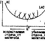 Во многих производствах возрастающая отдача от масштаба сменяется при достижении определенного объема выпуска убывающей. Производственной функции с таким переменным характером отдачи от масштаба соответствует и меняющаяся конфигурация кривой долгосрочных затрат. До определенного уровня производства кривая LTC выпукла вверх, а сверх него – вниз.