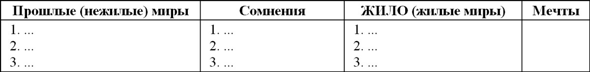 Как набрать сомнения? Записываете: я и там время провожу, и там, и там, и об этом думаю, и об этом. И у вас накопится огромная средняя графа. А из нее немножечко в Жилые. И много-много в Прошлые. Причем, нумеруйте, ставьте цифры: 1,2,3, чтоб потом вычеркивать. Наглядней будет видно, как убывает, что не есть ты. Копится чего-то там, в складе, и становится все меньше того, чем ты не владеешь. Называется это все на современном языке – ревизия.