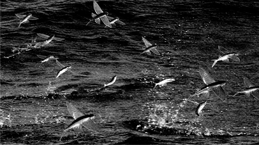 Вдруг из-под самого носа судна вынырнула стайка летучих рыб. Разгоняясь по воде, они начертили своими хвостами искрящийся веер.