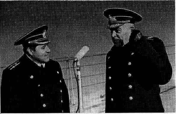 Это был мой последний поход в должности старшего помощника командира крейсера «Мурманск». Моим командиром был старый сослуживец по крейсеру «Чапаев» капитан 1 ранга Владимир Михайлович Гринчук. Фактически крейсер был кораблем управления силами, участвующими в учениях. На борту нашего корабля находился походный штаб командующего флотом адмирала С. М. Лобова. В качестве посредников при нем находились адмирал Н, И. Шибаев и контрадмирал В. М. Прокофьев. В составе штаба командующего были также член Военного совета флота адмирал Ф. Я. Сизов, и начальник походного штаба контр-адмирал Д.-И. Шимдель.