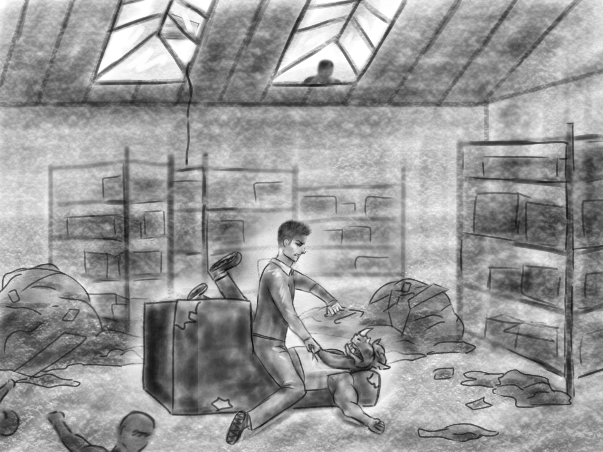 Первый медлил. Собравшись встать с кресла, фигура молниеносно побежала и кинула ствол вперед. Попав в нос, привставший по инерции сел обратно и схватился за рану руками. Тень набросилась на него с ужасной силой. Кресло опрокинулось назад, но нападавшему это никак не помешало. Фигура в бешенстве стала бить по лицу первого, вкладывая в это все свои силы.