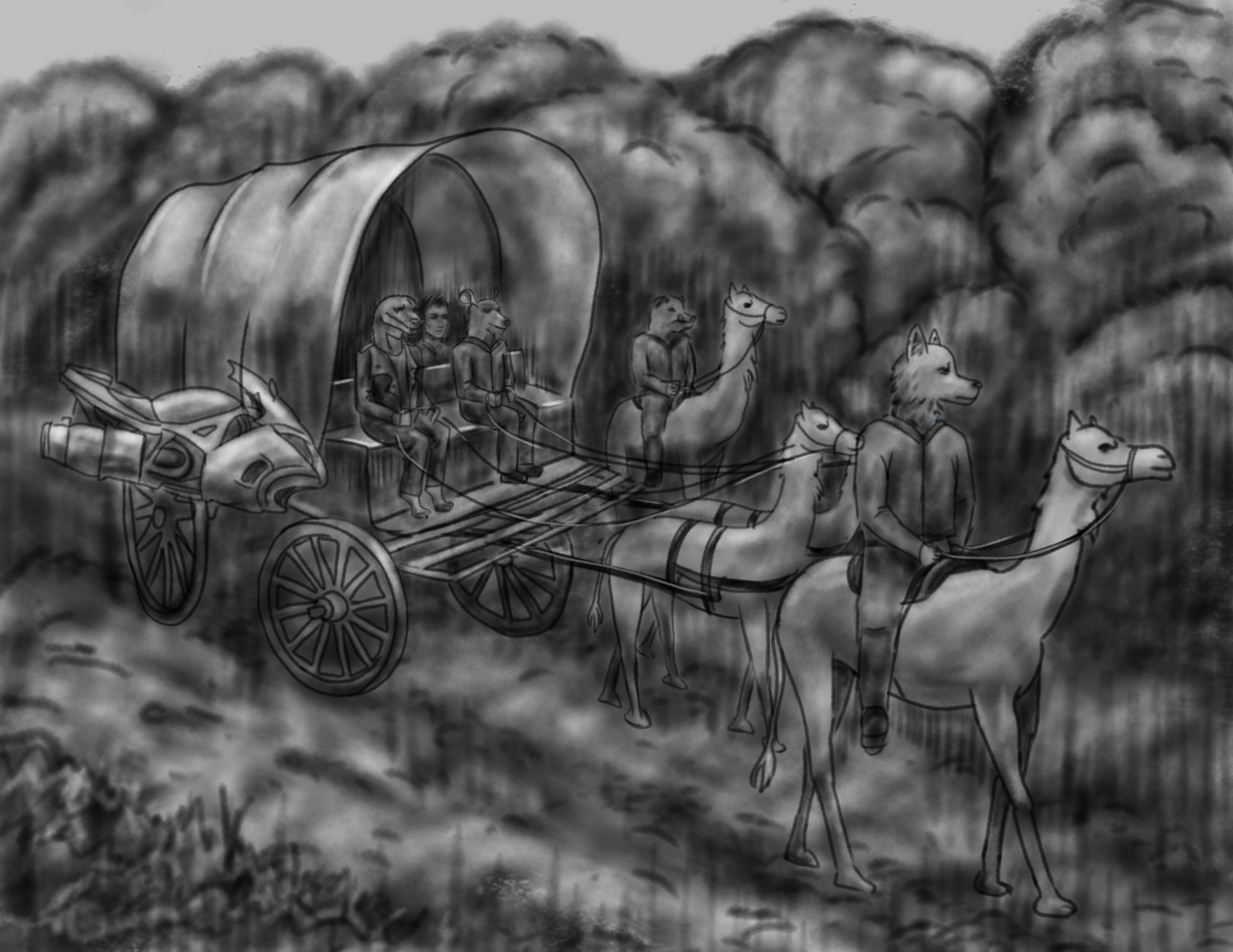 Звонкое щебетание птиц, жужжание комаров, словно неотъемлемый звуковой аккомпанемент, без которого не проходит ни одна прогулка или путешествие на природе. Яркое, слепящее глаза солнце – единственный источник тепла ранним холодным утром, когда ветер, еще не успевший нагуляться за ночь, догуливал свое на восходе и еще не нагретая земля буквально дышала свежестью. Этот морозный аромат передавался всем участникам движения по-разному: кто-то поплотнее закутывался в одежку, кто-то мужественно стучал зубами, кто-то в силу своего генома имел шерстный покров, а кто-то, как и Бейман, заправившись разогревающей жидкостью, ехал с блестящими, но все же полузакрытыми, глазами. Скучное прохладное утро постепенно перешло в невыносимо жаркий день. Дилан, весь в поту, выглядывал из окна повозки и смотрел на тех, кого утром считал везунчиками (мохнатых попутчиков с жалостью). Солнце стояло в зените.