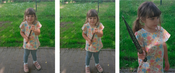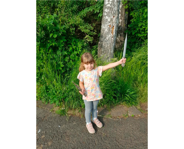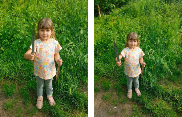 А тут мы уже на фронте. Я вытащила кинжал из ножен и стою на фоне врага в решительной позе, как видите. Уверена, что уже одним своим видом я внушаю крапиве страх и трепет. И дело закончилось бы для неё очень плохо, если бы не одна случайность. Дедушка сказал, что на меня кто-то сел. Я забеспокоилась, выронила кинжал и ножны и стала искать на себе непрошеного гостя.