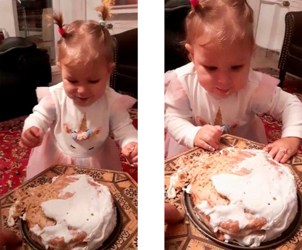 Узнаёте эту девочку? Тут мне исполнился годик. В подарок я получила среди прочего тортик, который мама и папа разрешили мне кушать ручками. И правильно сделали. Если бы я кушала ложечкой, я бы запачкалась ещё больше, потому что ещё не умею держать ложечку. Тортик был удивительно вкусный! Никогда ещё я не кушала в своей жизни ничего подобного!