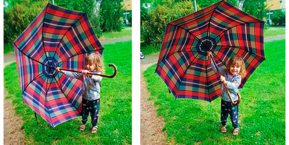 У меня есть детский зонтик, но он маленький – я не люблю его. Я люблю зонтики для взрослых. Если передвинуть на таком зонтике кнопку, он раскрывается и делается большим-большим. Вот только для этого мне не хватает сил. Дедушка сказал, когда я вырасту, у меня это будет получаться легко. «Но я ещё не скоро вырасту», – подумала я. «А вдруг дождь пойдёт до этого?». И я решила научиться раскрывать зонтик для взрослых до того, как я вырасту. Когда мы в следующий раз пошли с дедушкой гулять, я уговорила его взять с собой зонтик, хотя на небе не было ни облачка. Я потянула кнопку на зонтике, и неожиданно он раскрылся! «Получилось, получилось!» – закричала я и запрыгала от радости. Дедушка радовался вместе со мной и удивлялся, какая я уже сильная.