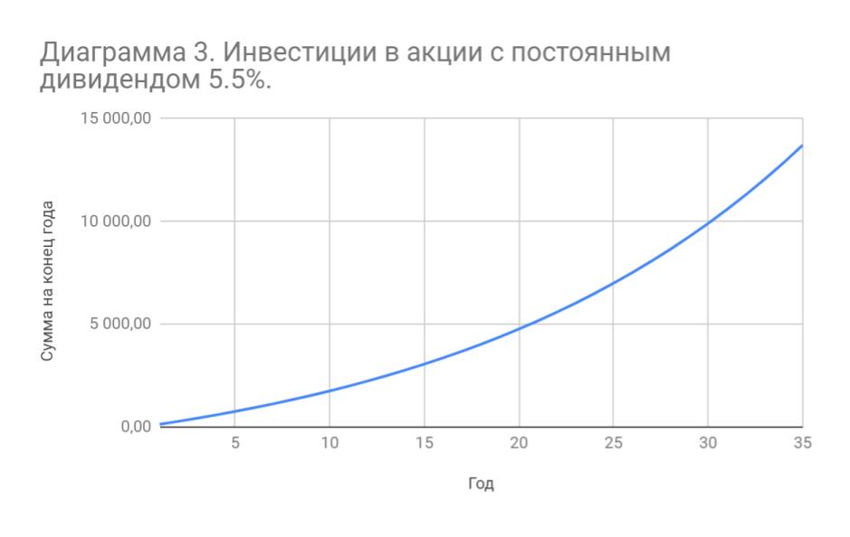 Вот расчет для случая с дивидендами, равными 5,5 %, которые не меняются из года в год: