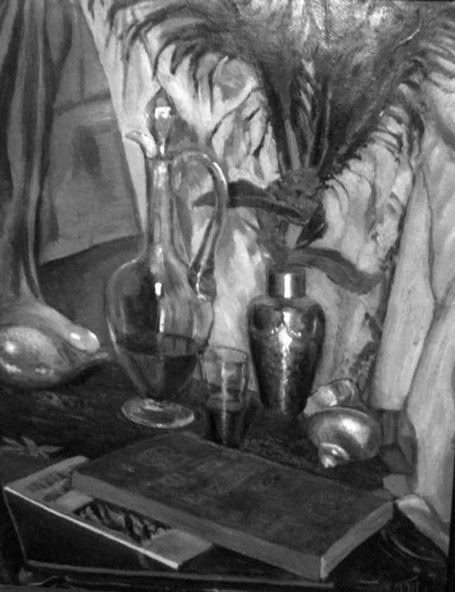 Направо от входа в кухню – комната Геннадия Николаевича, вся заставленная и завешанная его картинами. Большое окно в сад. Посреди мольберт с картиной «Двое влюблённых в беседке над Волгой» и кресло, постоянно занятое собачкой Каштанкой. Большой стол завален какими-то бумагами, шкаф, диван для сна. Картина на мольберте рисовалась с трудом и в следующий наш приезд была почти в том же состоянии.
