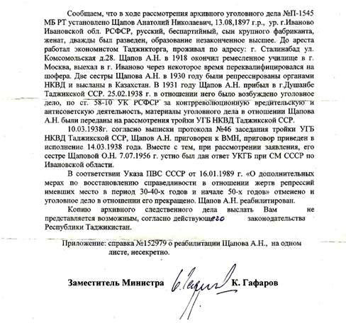 Выписка из письма Министерства безопасности Республики Таджикистан.