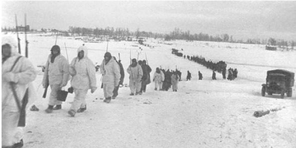 Фронт близок. Вступаем в полосу досягаемости дальнобойных орудий. Пронзая морозный воздух, шепелявя, летит нам навстречу снаряд. Вот он ударил позади, высоко подняв снежный гейзер. Доносится тяжелое уханье взрыва. Вот еще один и еще…