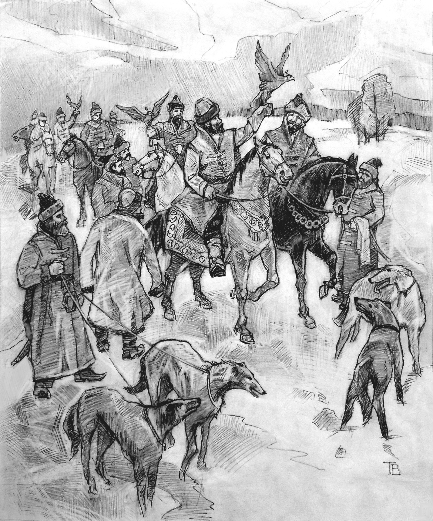 – Взгоняй!.. Гони собак! Напускать всем! – приказал разгорячённый царь и нетерпеливо поднял руку. К нему подбежали сокольники с шестом, на котором сидели соколы. Царь выбрал белого кречета и поскакал вслед за собаками. За ним устремилась вся пёстрая свита.