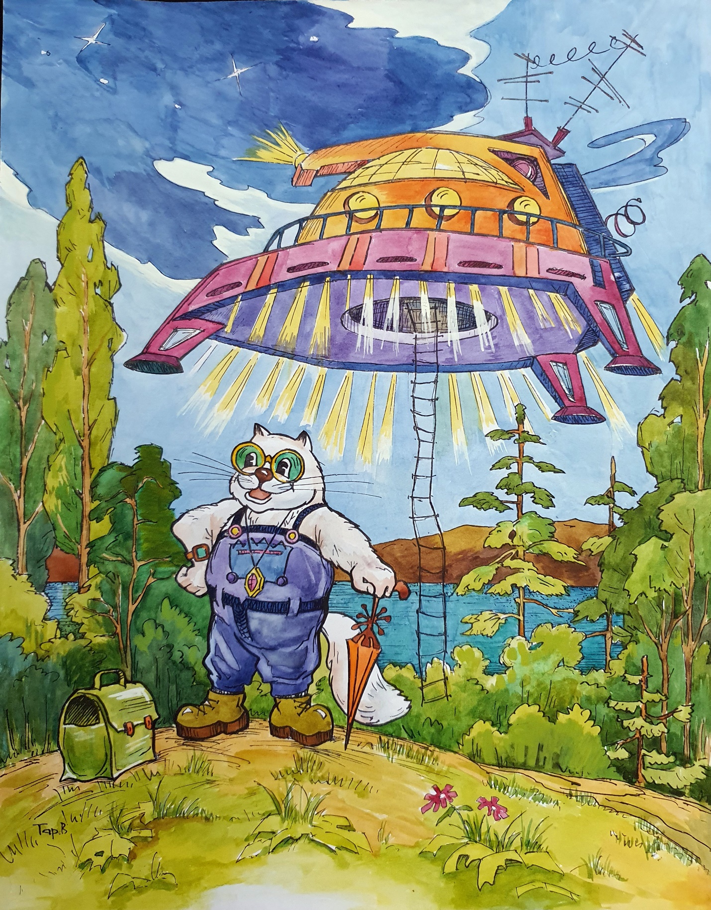 – Потому что, мышки-крышки, у тебя нет глаз на затылке, – хихикнул Август. Бубонька обернулся и увидел перед своим носом Августа. Он стоял в блестящем синем костюме с множеством кнопочек, в космических ботинках, в зелёных очках, с медальоном на шее, с портфелем и зонтиком. Позади него в воздухе висел странный космический аппарат, похожий на огромный утюг. Из подошвы утюга выходили тысячи лучей, будто сороконожка невероятного размера замерла на месте.