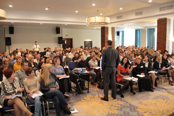 Кстати, я не знаю как и кто снимал этот кадр, но на этой фотографии «взгляд из-за спины Турова». Это тот самый семинар в Самаре в 2014 году. Спиной к тебе – Туров Владимир Викторович. И на этой фотке даже видно меня: я сижу во втором ряду, рядом с проектором, в джинсах и в черном джемпере (стрелкой обозначил).