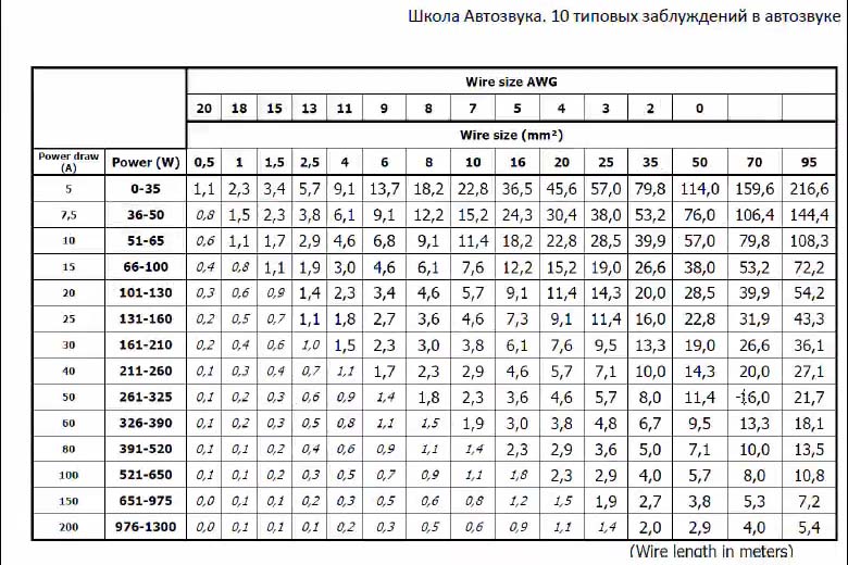 В книге «Типовые заблуждения в автозвуке», на странице 17, как раз идет речь о силовых проводах. Я там дал примерный расчет того, что вам нужно по питанию: какой нужен аккумулятор, какой генератор. Далее приводится расчет проводов, есть табличка. Ну и, соответственно, есть номиналы предохранителей.