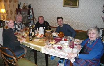 23 февраля 2008г отметили День рождения Юли – 81 год (без особых торжеств). На фото слева направо: Лида, Вовина жена, Я (уже «весёлый»), Андрей-муж Иры, Сашка – его старший сын, Юля.