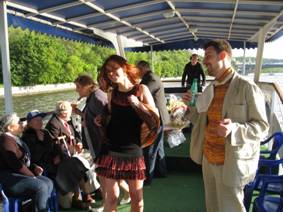 А 6 июня Вова расписался с Лидой и на 7 июня был заказан речной кораблик, где и проходили свадебные торжества. Загрузив около 70 человек гостей – лучших друзей и родственников, в 18 часов корабль отвалил от пристани возле Киевского вокзала. Погода стояла почти летняя, безоблачная, около 20 град. Было очень много громкой музыки, очень много самых разных спиртных напитков, прекрасная свежеизготовленная горячая и холодная закуска. Я здорово нагрузился! Зашел к капитану в рубку и попросил его раскачать пароход, чтобы сымитировать морскую бортовую качку – сказал, что я – «настоящий моряк!» (Я был в тельняшке и под хорошим градусом). Его помощник – громила, тут же «под локотки» молча выставил меня из рубки.
