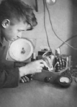 Вспомнил, что когда я учился в 6-ом классе, это был 44-й год, отец приезжал с фронта после госпиталя на пару недель. Он меня тогда здорово понатаскал по алгебре, а физика у меня шла отлично и в 7-ом – не зря я увлекался радио. Тогда я уже собрал супергетеродинный приемник и на коротких волнах слушал радиостанцию «Голос Америки»‑ тогда ее еще не глушили (На фото слева – настройка