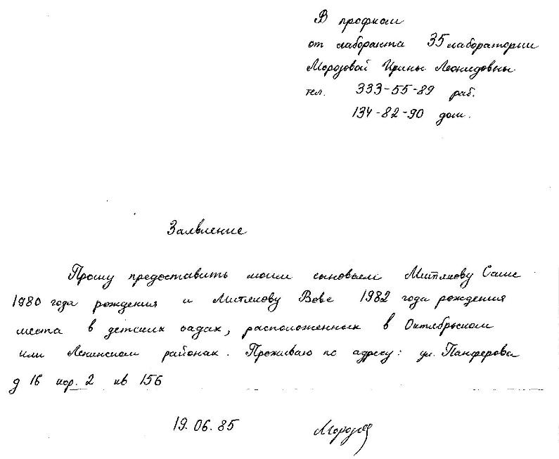 Когда я писал письмо Сергею, подошла ко мне Юля со слезами на глазах – она разбирала архив Иры и нашла её Заявление от 85 года о приеме в детский сад её детей Саши и Вовы, и попросила: «Володя, вставь это написанное рукой Иры Заявление в свои Мемуары на добрую память об их Маме: