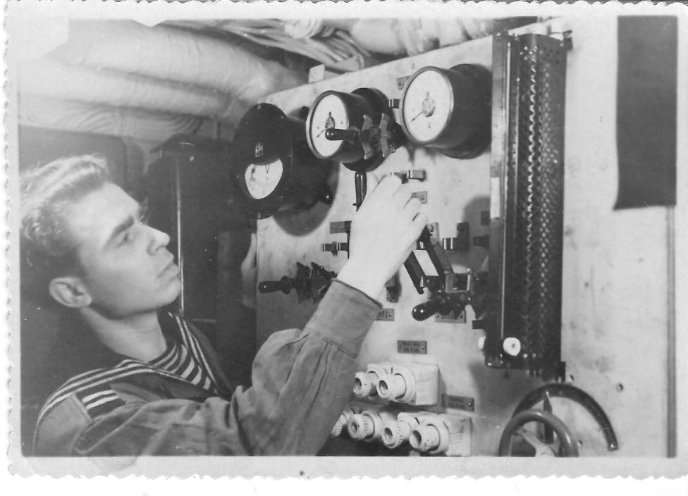 Бросил рюкзачок на указанную мне койку и спустился вместе с к/л-том Сошальским в главный гиропост – знакомиться с командой штурманских электриков. Стоят двое старослужащих, один маленький, старшина 1-ой статьи, худенький и бледный блондин, рядом – старшина 2-ой статьи, с круглым широкоскулым лицом крестьянина, ростом повыше и тоже бледный. Оба с 1927г. рожд., отслужили уже по 7 лет, призваны были в самом конце войны и вот уже два года ждут демобилизации. А рядом с ними, ба!!!, знакомая фигура моего сослуживца по учебному отряду Сергея Щеглова! Круглолицый, приземистый крепыш-меланхолик из г. Куйбышева (сейчас г. Самара, кажется). На уроках много спал, а экзамены по специальности сдал на тройку. Обрадовался я очень! Познакомились. Моим старшинам командование поставило условие демобилизации: подготовить замену в походе. (Что они успешно и выполнили ‑ по приходу корабля из похода их отпустили).