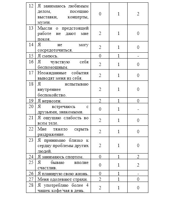 Если вы набрали 0 – 11 баллов – вы обладаете высоким уровнем стрессоустойчивости. Вы четко определяете цели и пути их достижения, умеете и стремитесь рационально распределять время, можете долгое время работать с большим напряжением сил. Неожиданности, как правило, не выбивают вас из колеи. Круг ваших интересов достаточно широк.