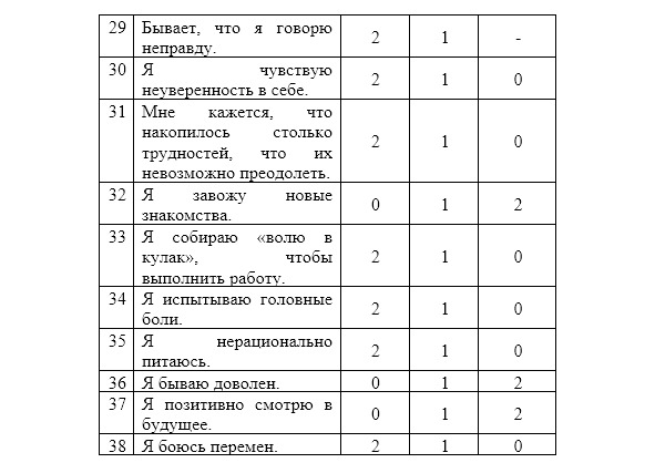 Дальнейшая обработка осуществляется в суммировании количества баллов, отмеченных вами в таблице. Интерпретация результатов проводится в соответствии с набранным количеством баллов.
