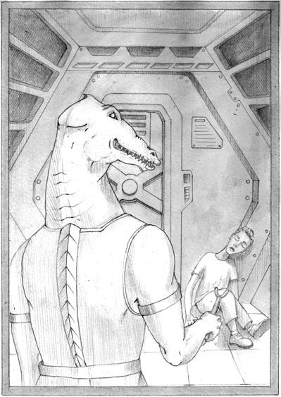 Мальчик поднялся с холодного гладкого пола и выпрямился. Его макушка доставала максимум до пояса ящера. Оглядевшись, он увидел, что стоит на небольшом мостике над какими-то механизмами. Ему было страшно от всего того, что происходило с ним и его друзьями. Как вместо любования лунным затмением они оказались на каком-то корабле с огромным ящером. Он находился на относительно небольшой высоте, но, несмотря на это, почувствовал напряжение. Да ещё и эта зверюга, которая его бросила на пол, чуть не оторвав руку.