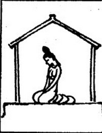 Иероглиф «Благополучие» (современное начертание) – состоит из непосредственно изображения строения и иероглифа «Женщина» (коленопреклонённая женщина): Женщина в Доме – Благополучие. И образ иероглифа «Благополучие» (справа -древнее изображение).