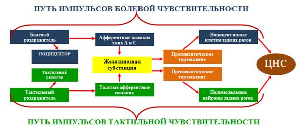 Если возбуждаются ноцицепторы, то импульсы поступают по волокнам группы А и С в центральную нервную систему на полимодальные нейроны вызывая их возбуждение, а по коллатералям импульсы поступают в желатинозную субстанцию, где по принципу постсинаптического торможения – тормозятся, т. е. уменьшается их влияние на полимодальные нейроны и болевая чувствительность повышается.