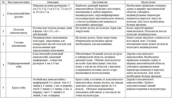 Обычные размеры кинезиотейпов – «Клиник-ролл» 5 cм х 31,5 м, «Стандарт» 5 cм х 5 м, 7,5 cм х 5 м, 10 cм х 5 м. Тейпы смотаны в рулоны, каждый рулон упакован индивидуально. Ассортимент тейпов разнообразен – это и нарезанные лимфодренирующие кинезиотейпы, готовые аппликации кинезиотейпа для наклеивания на конкретные анатомические структуры или индивидуально в зависимости от показаний, кросс-тейпы («cross tapes»), эластичные тейпы для детей, атлетические тейпы и т. д. (таб. 1).