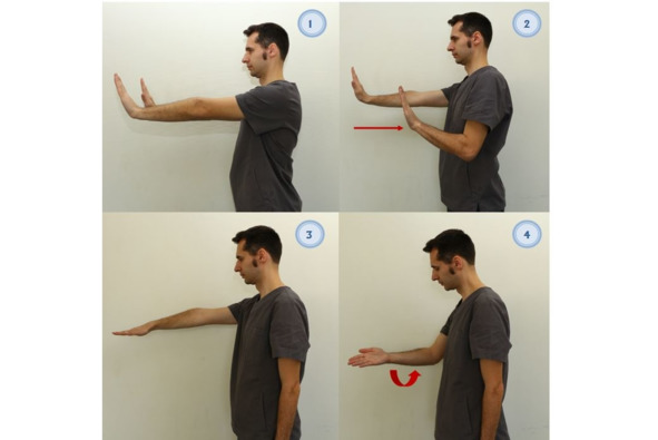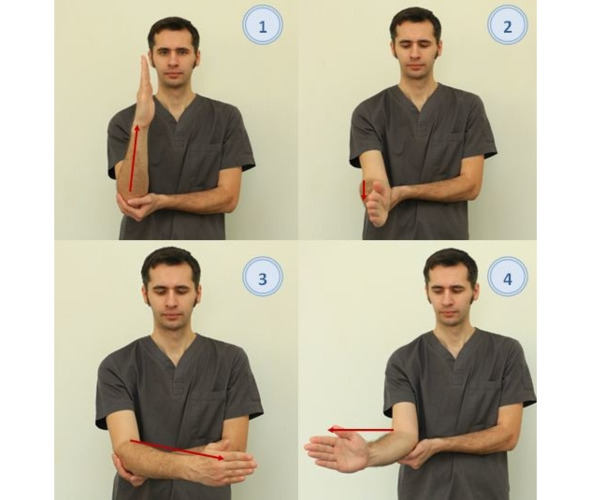 Рисунок 10. Упражнение лечебной физкультуры: 1. Исходное положение «стоя» или «сидя», левой рукой под локоть поддерживаем правую руку. Правая рука согнута в локте; 2—4. Показана смена положения правой руки. Повторяем по 10—15 раз для правой и левой руки.
