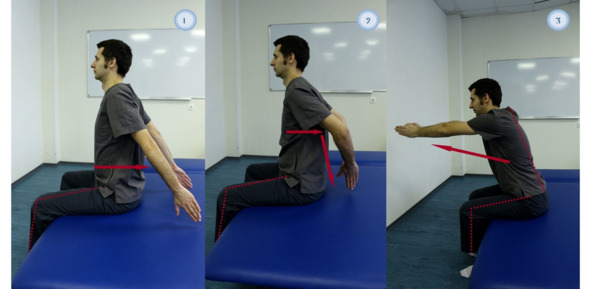 Рисунок 12. Упражнение лечебной физкультуры, используется стол для Войта-Бобат терапии: 1. Исходное положение «сидя», руки выпрямлены отведены за спину, ноги согнуты в коленных суставах, стопы слегка развернуты кнаружи; 2. То же положение, но руки согнуты в локтях, задерживаем положение на 10 сек; 3. Руки выпрямлены вперед, ноги согнуты в коленных суставах, стопы слегка развернуты кнаружи. Тянемся корпусом вперед, оставляя спину прямой, задерживаем положение на 5—10 сек., возвращаясь в исходное. Выполняем 8—10 повторов.