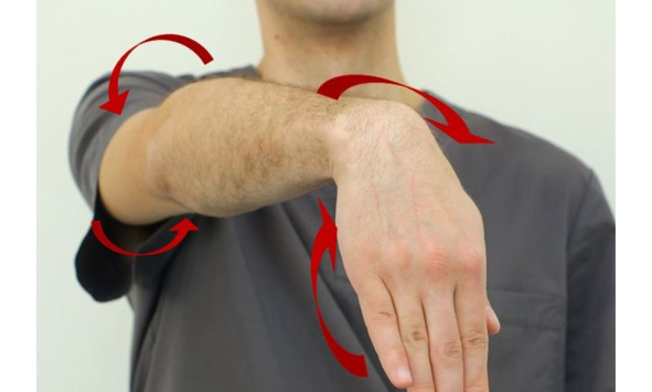 – В исходном положении стоя или сидя с вытянутой вперед рукой – выполнить круговые вращения в плечевом суставе и в кисти поочередно по часовой стрелке и против по 5 раз в каждом направлении. Выполнить поочередно для левой и правой руки (рис. 14);