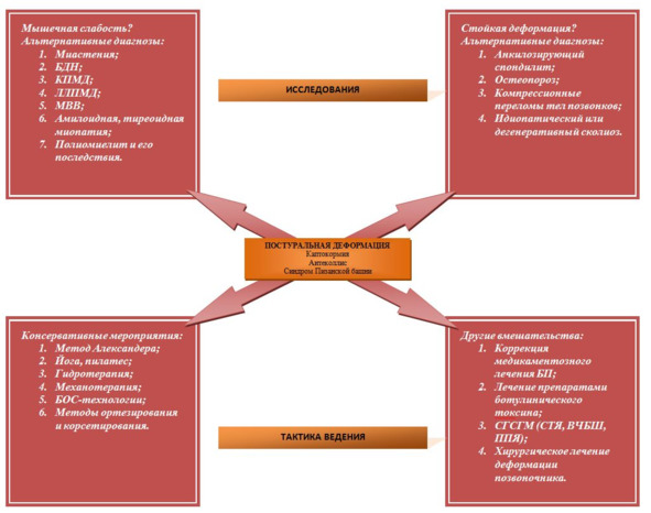 Рис. 8. Дифференциальная диагностика, исследования и варианты лечения постуральных деформаций при болезни Паркинсона БДН – болезнь двигательного нейрона. БОС – биологическая обратная связь. КПМД – конечностно-поясная мышечная дистрофия. ЛЛПМД – лице-лопаточно-лицевая мышечная дистрофия. МВВ – миозит (миопатия) с внутриклеточными включениями. АХР – ацетилхолиновые рецепторы. АТ – антитела. КК – креатинкиназа. ЭМГ – электромиография. СГСГМ – стимуляция глубоких структур головного мозга. СТЯ – субталамическое ядро. ВЧБШ – внутренняя часть бледного шара. ППЯ – педункулопонтинное ядро.