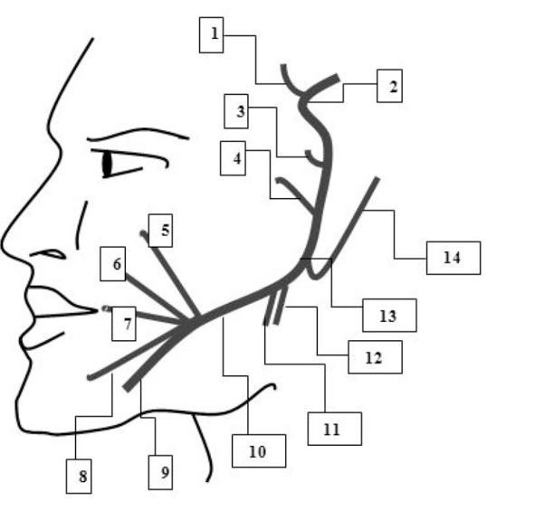 ветвь; 13 – шилососцевидное отверстие; 14 – задний ушной нерв.