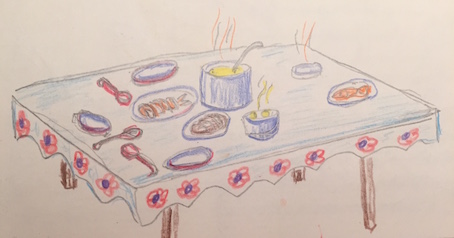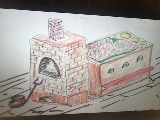 А это печка тёплая, в ней можно печь хлеб и булочки, и пирожки, и котлетки с пюре, и компотик, и много всего другого. А также спать, играть и рассказывать страшные истории, слушать сверчка, что всегда живёт за печками. Он весёлый.