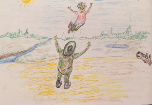 Охотник Жена очень обрадовался ребятам, лошадь Амуниция тоже радостно заржала, даже овес перестала хрумкать. Они все, кроме лошади, дружно обнялись, Охотник взъерошил мальчишкам волосы, а Сеньку подбросил высоко в воздух. Сенька восторженно визжала, мальчишки весело смеялись, лошадь Амуниция застенчиво улыбалась: ее никто никогда не подбрасывал в воздух, и она просто радовалась за Сеньку.