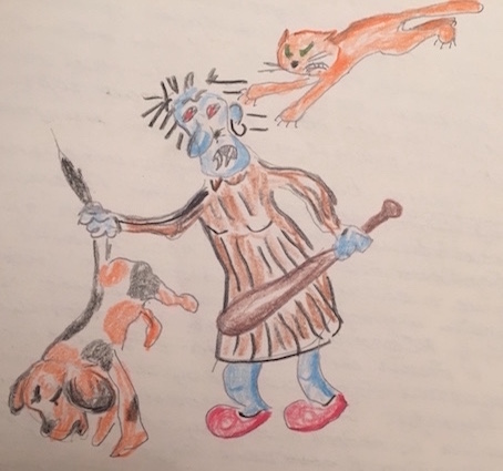 Котыч, который сидел в это время на ветке дуба прямо над схваткой, недолго думая, прыгнул сверху на Бабцу и вцепился ей в волосы. Точнее сказать, патлы. Бабец от неожиданности разжала лапу, и Барбоска, получив свободу, стремглав пустился наутёк, Гиена бросилась за ним. В это время Синяя Огурца опомнилась и схватила отважного Котыча за шкирку, оторвала от своей башки и уставилась на него своими красными буркалами, держа на вытянутой руке. Костлявая лапа всё сильнее сжимала шею кота и единственное, что тот мог сделать – это уписаться от ужаса. Что он и сделал.