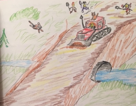 Их удивлению не было конца, когда, подъехав к мосту, где должен быть обрыв, они обрыва не обнаружили. Зато обнаружили работающий бульдозер, соседа Матюшу за рычагами и еще много мальчишек и девчонок из Дубравы, кто с лопатами, кто с носилками. Красный Трак заметили, узнали издалека и радостно приветствовали подъехавших. Из кустов, весело маша ушами, выскочил Барбоска. Котыч важно сидел на крыше бульдозера. Он приветственно поднял переднюю лап