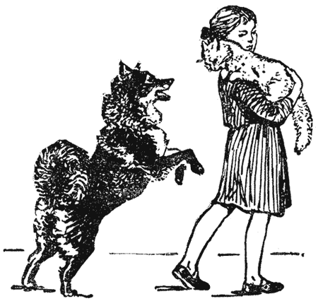 Вдруг мимо нас из передней метнулось большое, черное, а перед этим черным стремительно через всю столовую пронесся обратно в кухню белый взъерошенный клубок. Мы с Леной бросились в кухню и застали финал: на самой верхней полке, среди кастрюль, вцепившись когтями в дерево полки, свесив толстый, как ламповая щетка, белый хвост и склонив голову, кошка глядела вниз совсем черными глазами: так от страха расширились ее зрачки.
