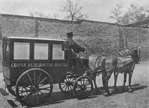 В 1908 г. в Санкт-Петербурге создается Общество скорой медицинской помощи, а в 1912 г. появляется первый санитарный автомобиль для перевозки больных.