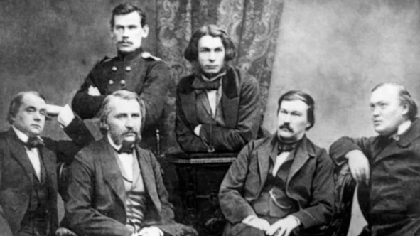 Постоянные сотрудники журнала «Современник», верхний ряд: Лев Толстой, Дмитрий Григорович, нижний ряд: Иван Гончаров, Иван Тургенев, Александр Дружинин, Александр Островский.