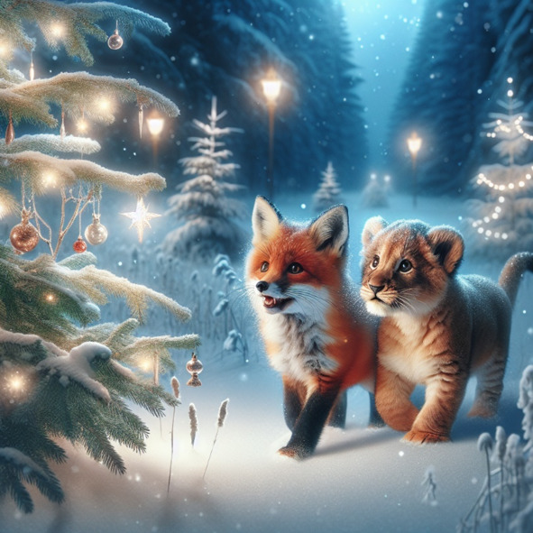 На своих спинках Лисёнок и Львёнок отправились в путешествие по лесу, проникая в самые таинственные его уголки. Они мечтали найти самый долгожданный подарок Нового года – незабываемые мгновения счастья и веселья.