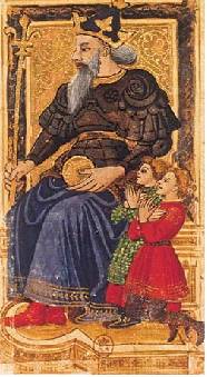 На четвёртой карте был изображён сам его Величество Карл V. Его черты были переданы великолепно. Тонкую проседь на волосах Гийом прорисовал при помощи серебра, не иначе. Взгляд благородный и спокойный, взгляд короля, которого так любил народ. Перед ним на коленях подданные, упоенно смотрящие на короля и сложившие перед ним, как перед Богом, руки. Карла V высоко почитали во Франции, он был отцом Карла VI и одним из лучших правителей за историю.