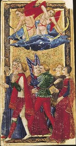 Шестая картина показывала три пары влюблённых, которым дарили стрелы херувимы небесные. Они были разодеты в синие и красные одежды – символ мужского и женского начала. Гийом, проказник, даже изобразил гениталии ангелам. А пара посередине вообще целовалась, причём располагалась она так, что под облаками, на которых были стреляющие ангелы, пару эту видно не было.