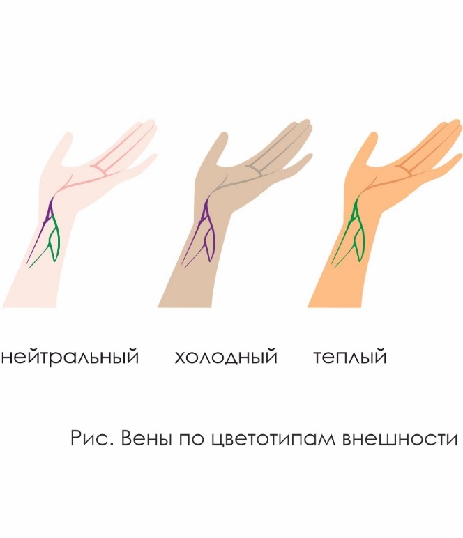 Зеленые вены – теплый цветотип, фиолетовые и синие – холодный. Есть и зеленые, и фиолетовые вены – нейтральный цветотип.