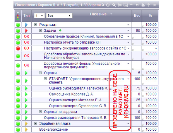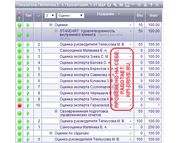 Но если мы видим, что сотрудник адаптировался к системе KPI-управления, а результаты в программу KPI-Drive он заносит своевременно, качественно, отчитывается с учетом всех требований, то эта оценка, отработав себя, меняется. Либо удельный вес этой оценки распределяется на другие показатели, которые в матрице есть.